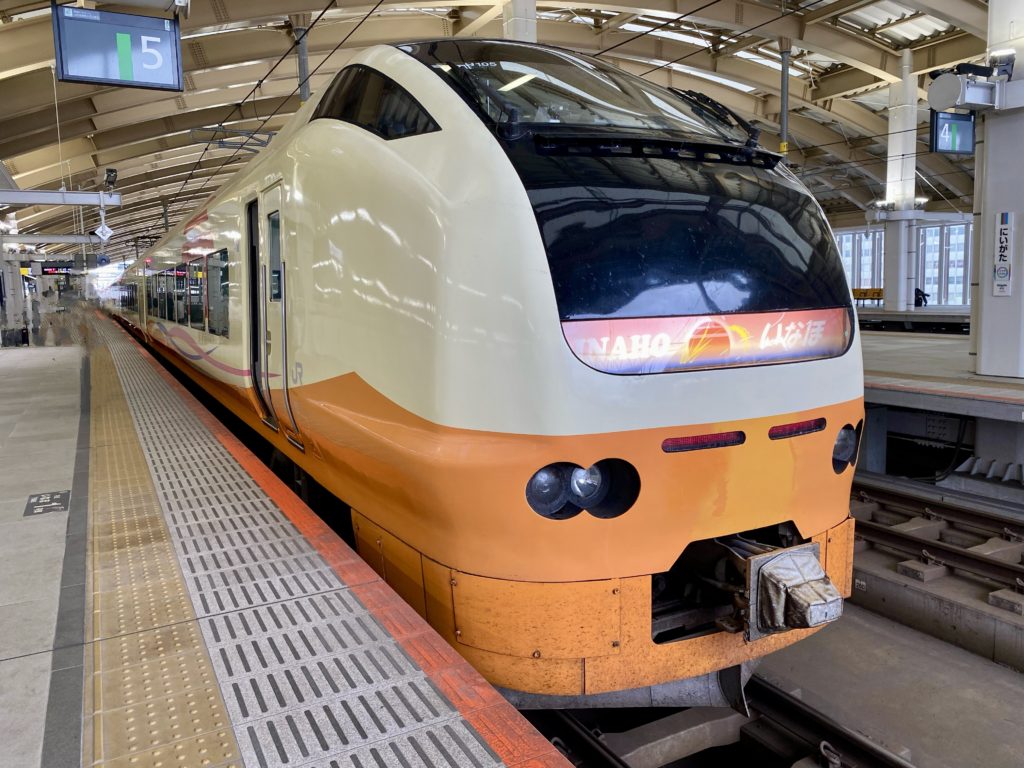 長野駅から北陸新幹線に乗り、高崎駅で上越新幹線に乗り換えて新潟に行き、新潟駅から羽越本線の特急「いなほ」に乗って鶴岡駅に向かいます。列車に乗っている時間は4時間余りです。